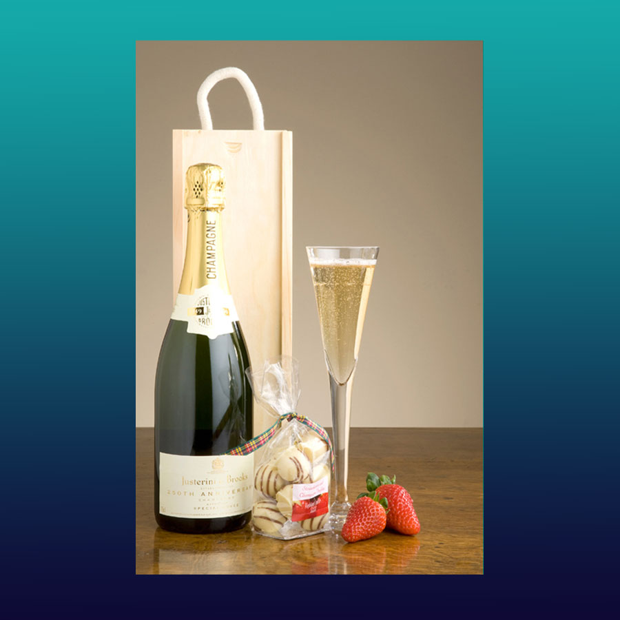 Champagne and chocolate – a delicious treat and perfect together. We partner an assortment of 8 delicious chocolate truffles,with a bottle of Justerini and Brooks 250 Cuvee Champagne.