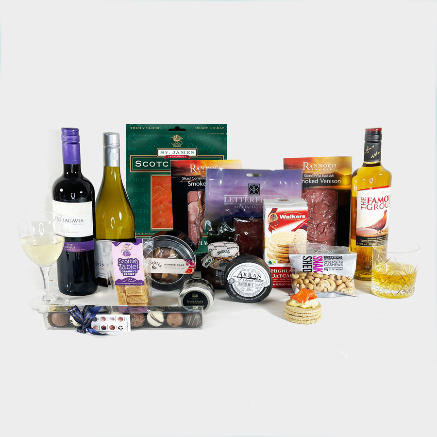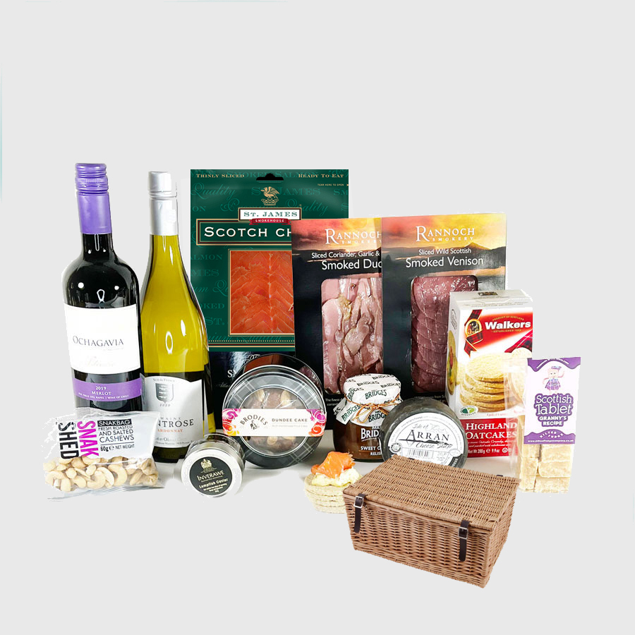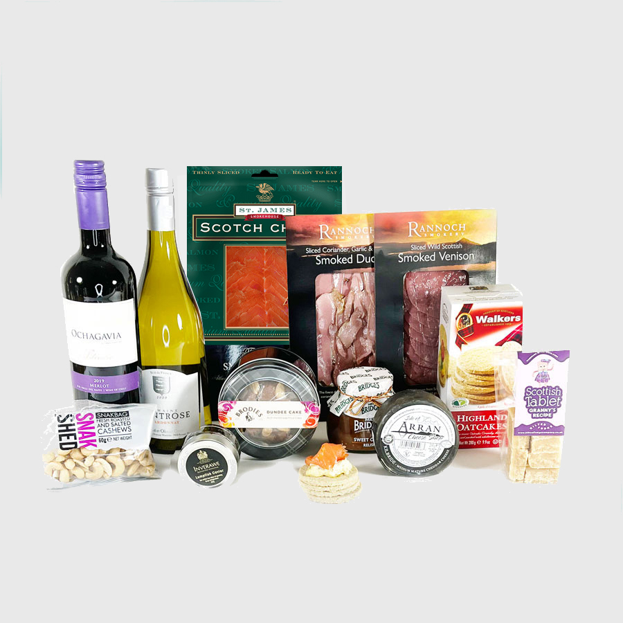 Lunch like a Laird with this assortment of foodie treats, perfect for a celebration. A selection of smoked meat and fish, cheese, oatcakes and chutney, a bottle of red and white wine and some nuts and fudge to nibble on too !