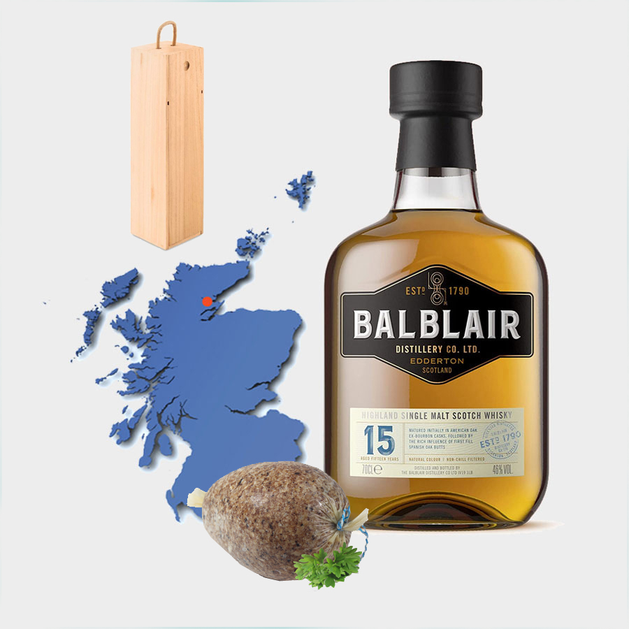 Balblair Malt Whisky And Haggis presented in a Wooden Gift Box