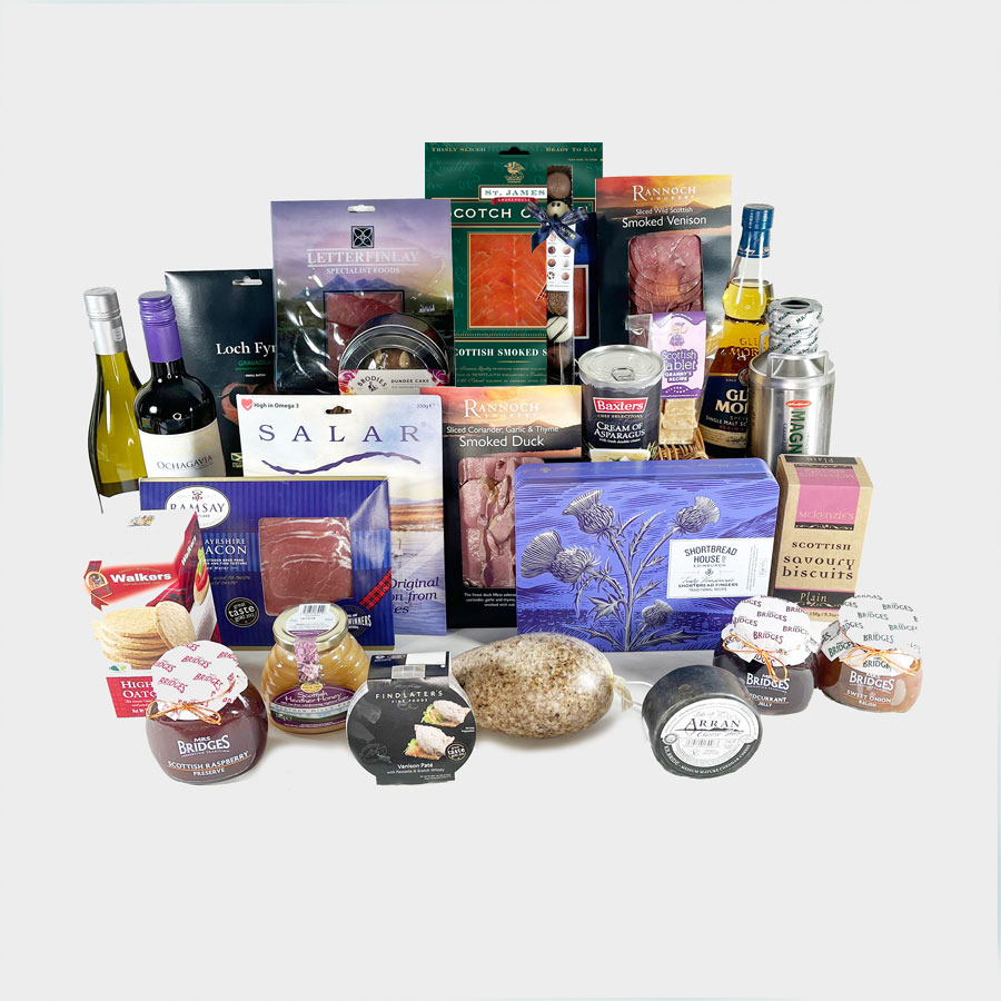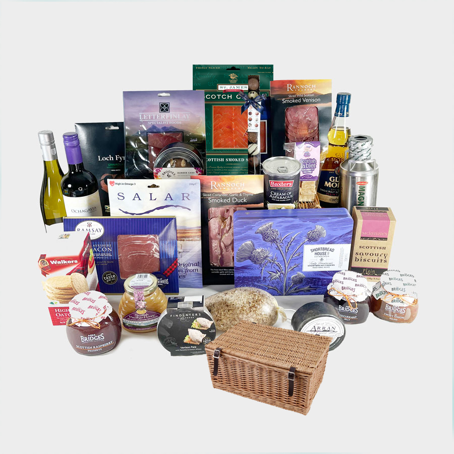 Our most magnificent hamper, bursting with all the very best gourmet food that Scotland has to offer. Smoked salmon, duck, venison, bacon, shortbread, whisky, wine, cheese, cake, chocolate – just too much to mention here! For an exceptionally fine gift the Monarch of the Glen hamper has it all