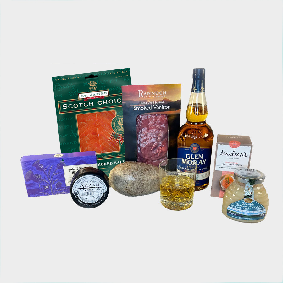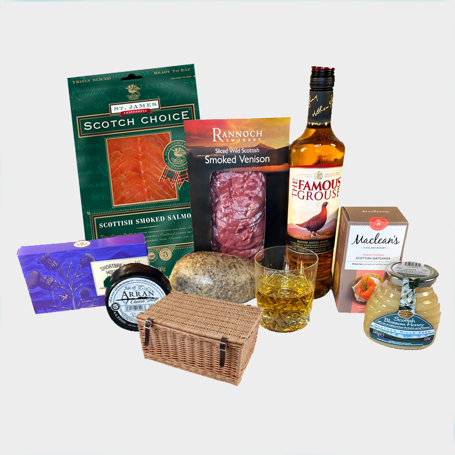 Smoked salmon, haggis, whisky, venison, cheese, honey, oatcakes and shortbread give this hamper a real flavour of the North.