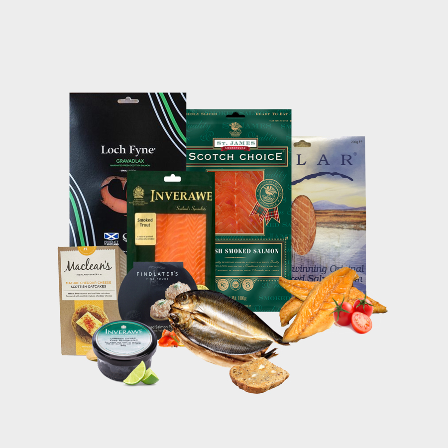 A boxed Hamper containing our most popular Smoked Seafood hamper with even more luxuries including Findlater’s Roast Smoked Salmon Pate and Maclean’s Oatcakes.